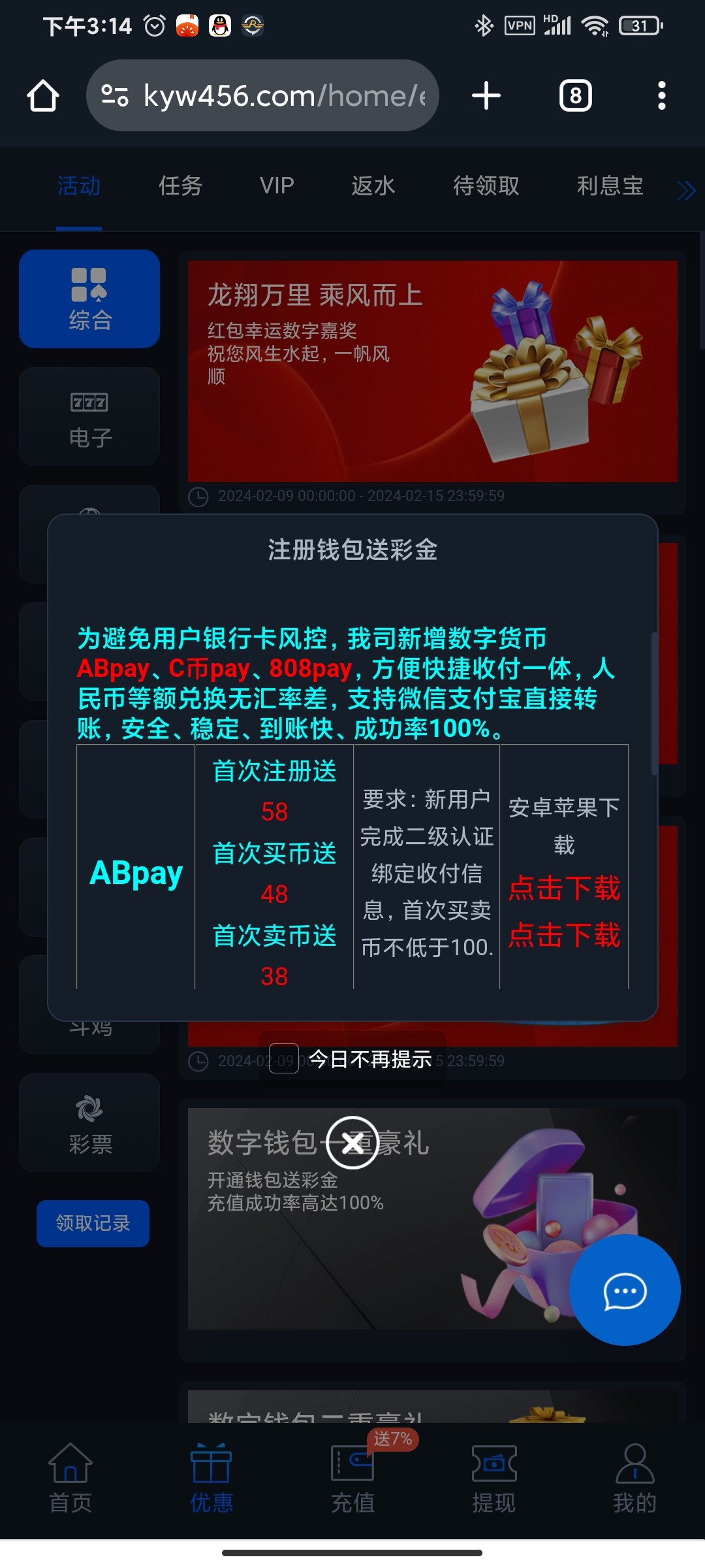这台子虚拟币送百分之七也很给力  都是一杯流水  稳的平台活动基本都不会花里胡哨  现在虚拟币充值送的一共都快800了