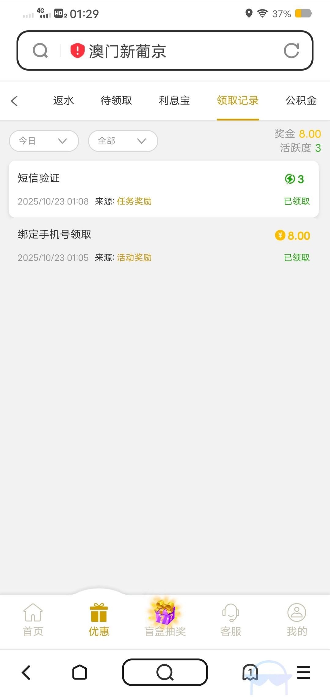手机上来的短信登录进去的,网址www.378.com,手机短信验证给了8块,没打出来,老哥们可以去试试,严禁充值!!!