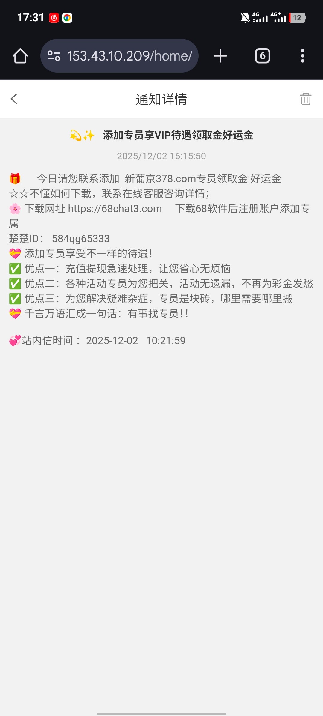 收到站内信 添加专员领取彩金