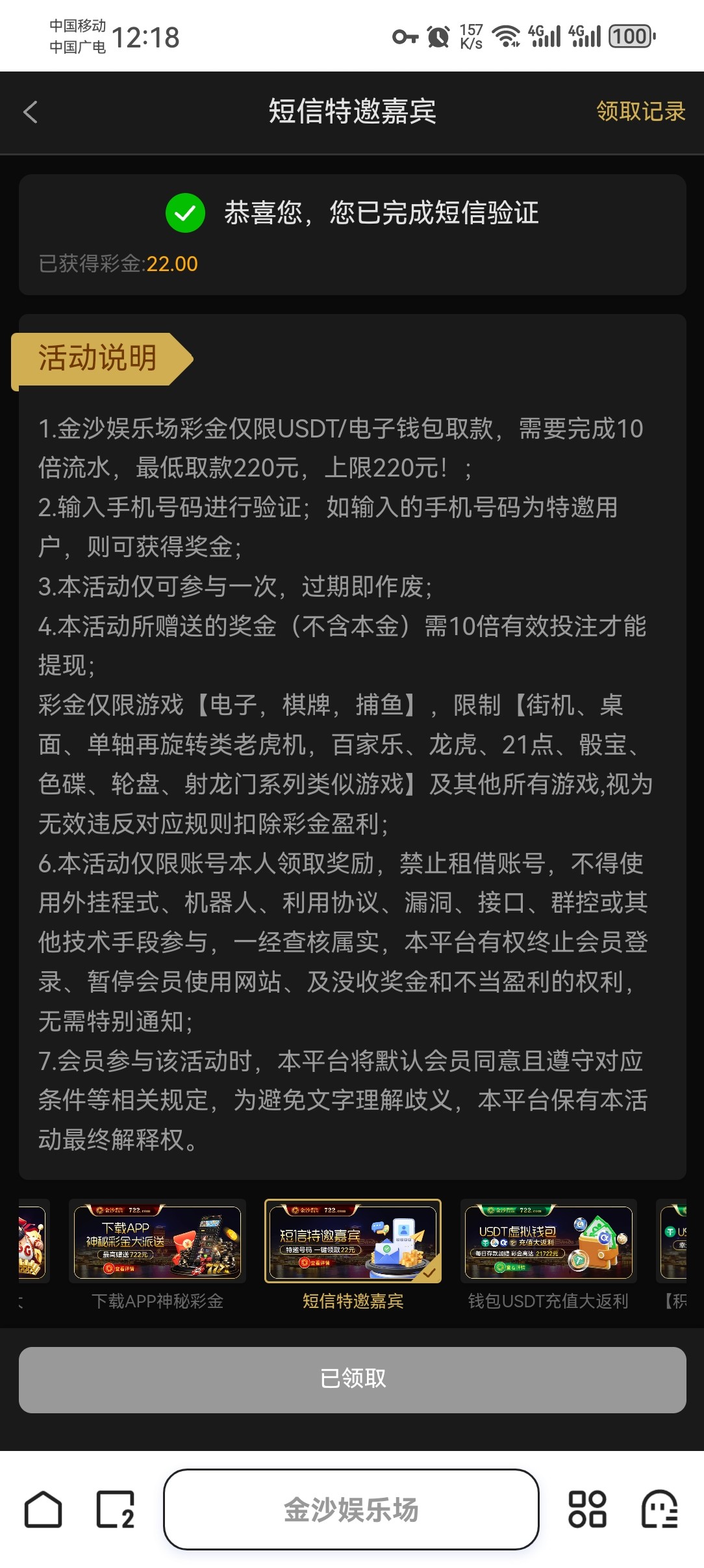 注册下载,验证手机号送22,限制220出款,我拉0.8麻二出了,这个比较容易碰到
