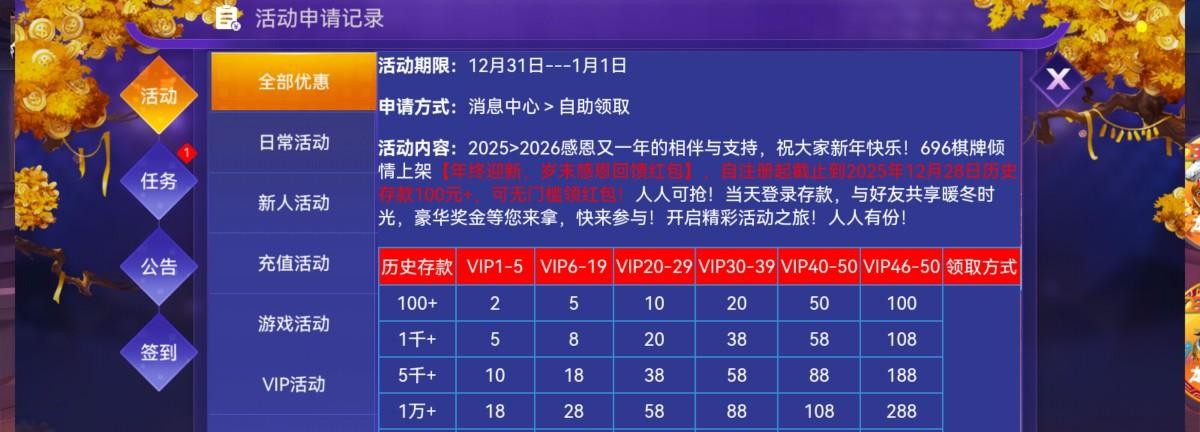 网址 696.tc 历史充值过的今天晚上8点可以领回馈,领多少看图,没充值过的不用去了,另外如果优惠封了去发邮箱反馈,我原来是捕鱼以小博大的时候给的彩金老打棋牌被封了优惠,后来自己发邮箱反馈申诉,发了邮箱之后让我充值打活跃度我就没吊他,结果隔了一段时间上去就自己解开了