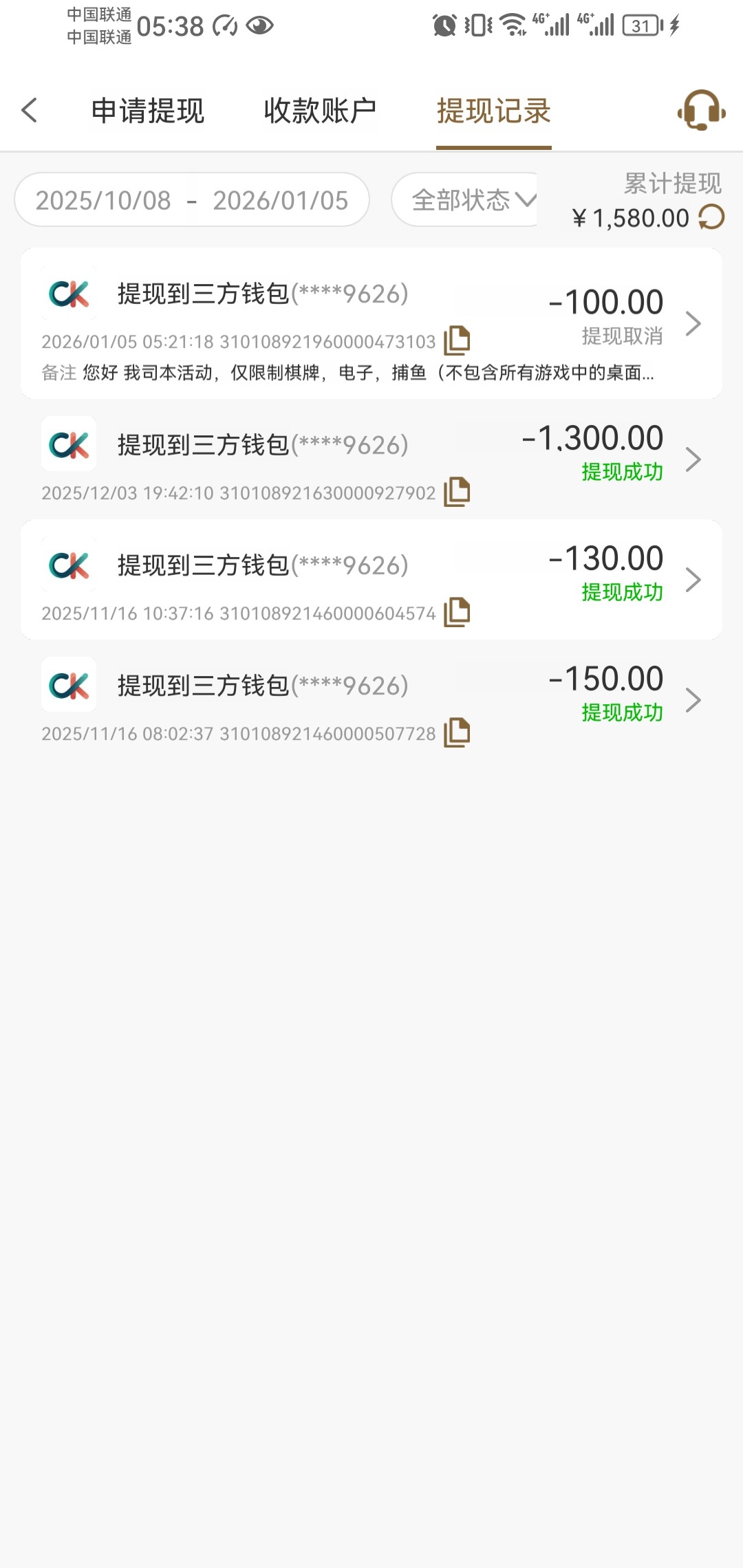 上个月充大几百,这个月领了5块钱,干到100,直接取消出款,这帮狗台没啥钱,玩不起的。