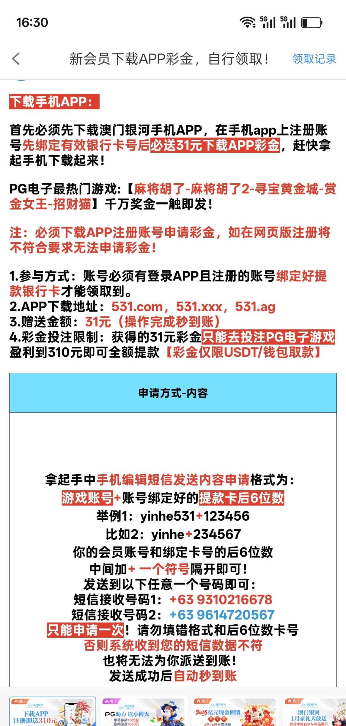一定要先下载APP再注册账号,然后发送短信是秒到的,能不能提款?目前还不知道,各位都试一下吧,能提款的话给个反馈,谢谢531.com短信链接a.ayapjl.com/A3fY
