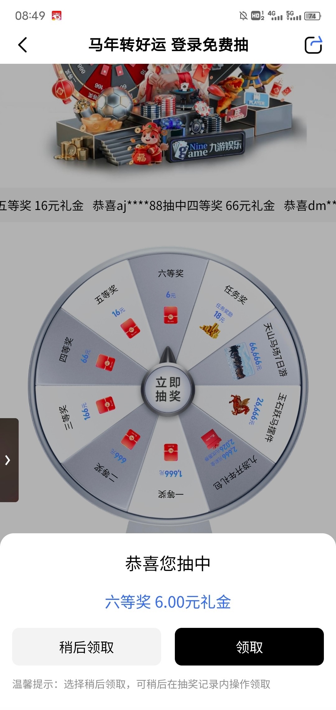 【九游娱乐】每日免费转盘